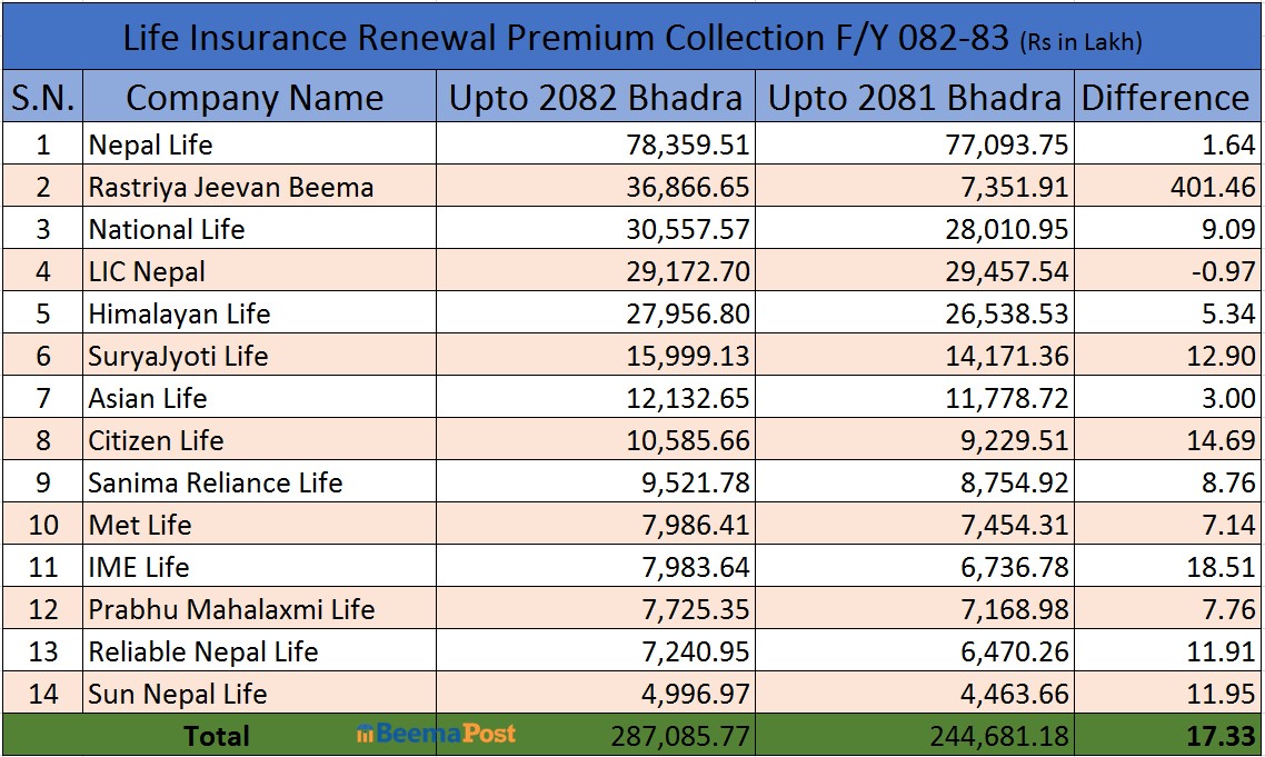 जीवन बीमकको नवीकरण बीमाशुल्क आर्जन १७ प्रतिशत बढ्यो, नेपाल लाइफ र राष्ट्रिय जीवन बीमा अगाडी