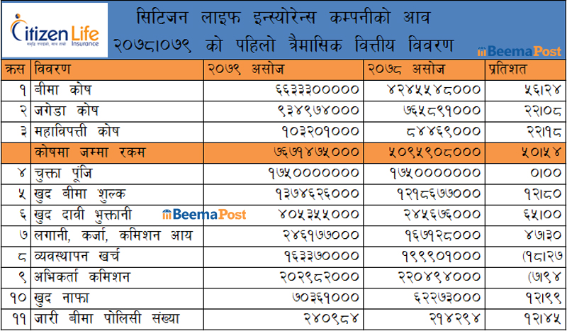 सिटिजन लाइफको जीवन बीमा कोष ५६ प्रतिशतले बढ्यो, अन्य वित्तिय सूचांक सकारात्मक