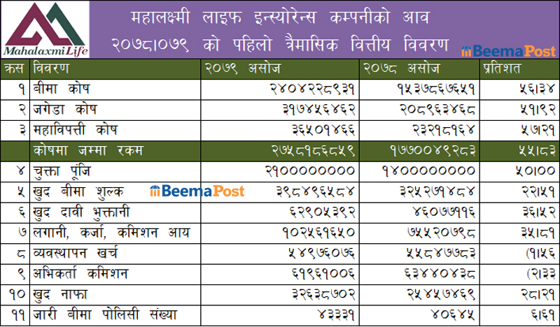महालक्ष्मी लाइफ इन्स्योरेन्सको खुद बीमाशुल्क आर्जन २२ प्रतिशत बढ्यो, अभिकर्ता कमीशन घट्यो