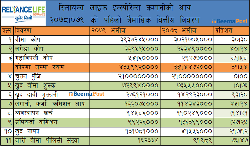 वित्तीय विवरणमा रिलायन्स लाइफको प्रगति, झण्डै चार अर्बको जीवन बीमा कोष, आम्दानीमा बृद्धि, खर्च घट्दा इपिएस २५ रुपैयाँ माथि