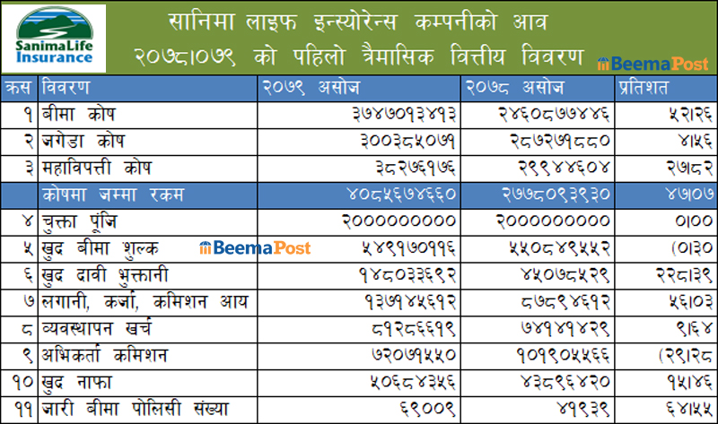 सानिमा लाइफको बीमा कोष ५२ प्रतिशतले बढ्यो, बीमा शुल्क आम्दानीसहितका सबै सूचांकमा सकारात्मक प्रगति