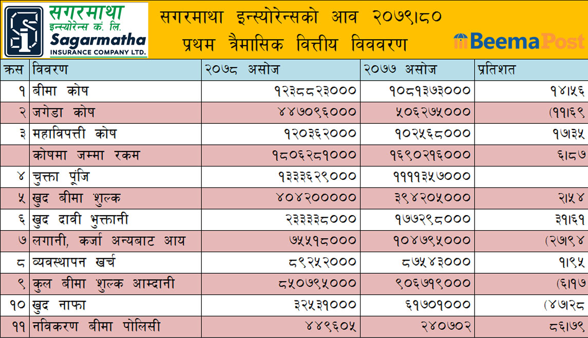 सगरमाथा इन्स्योेरेन्सको वित्तीय विवरण मिश्रित, कूल बीमा शुल्क आम्दानी र नाफा घट्यो