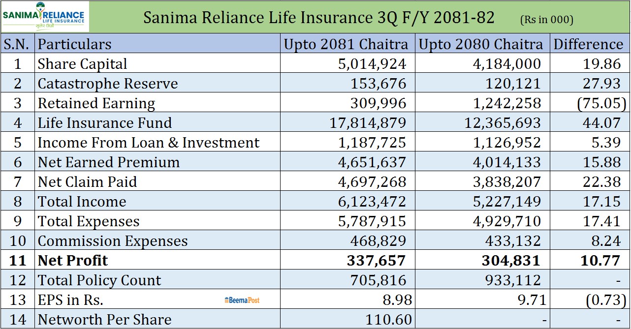 सानिमा रिलायन्स लाइफको नाफा करीब ११ प्रतिशत बढ्यो, जीवन बीमा कोष १८ अर्ब नजिक