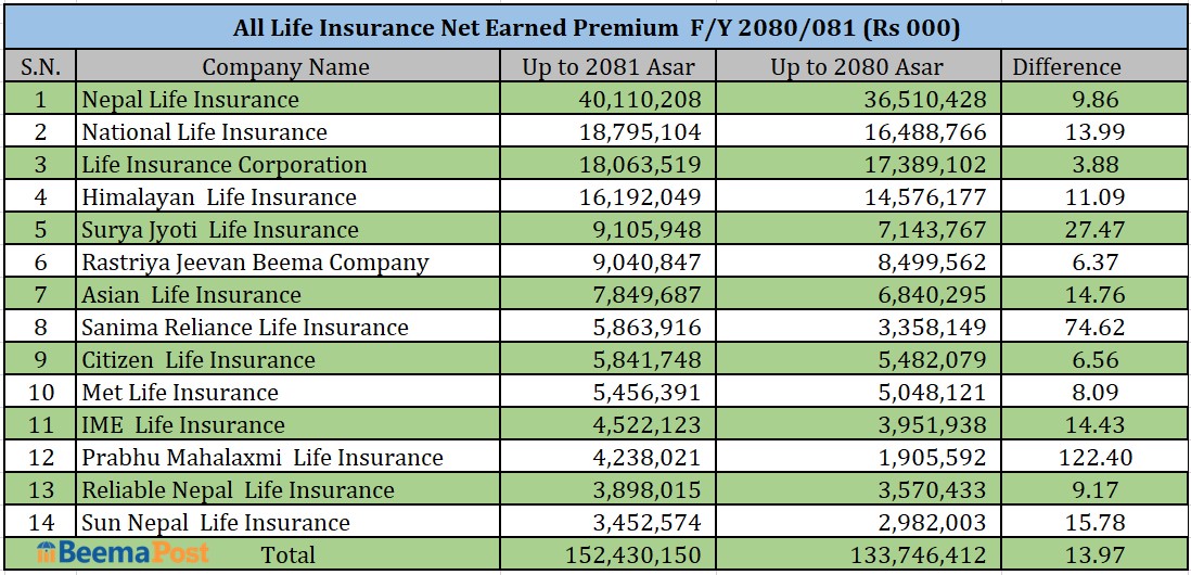 जीवन बीमा कम्पनीहरुको खुद बीमा शुल्क आर्जन १४% वृद्धि, कुनको कति ?