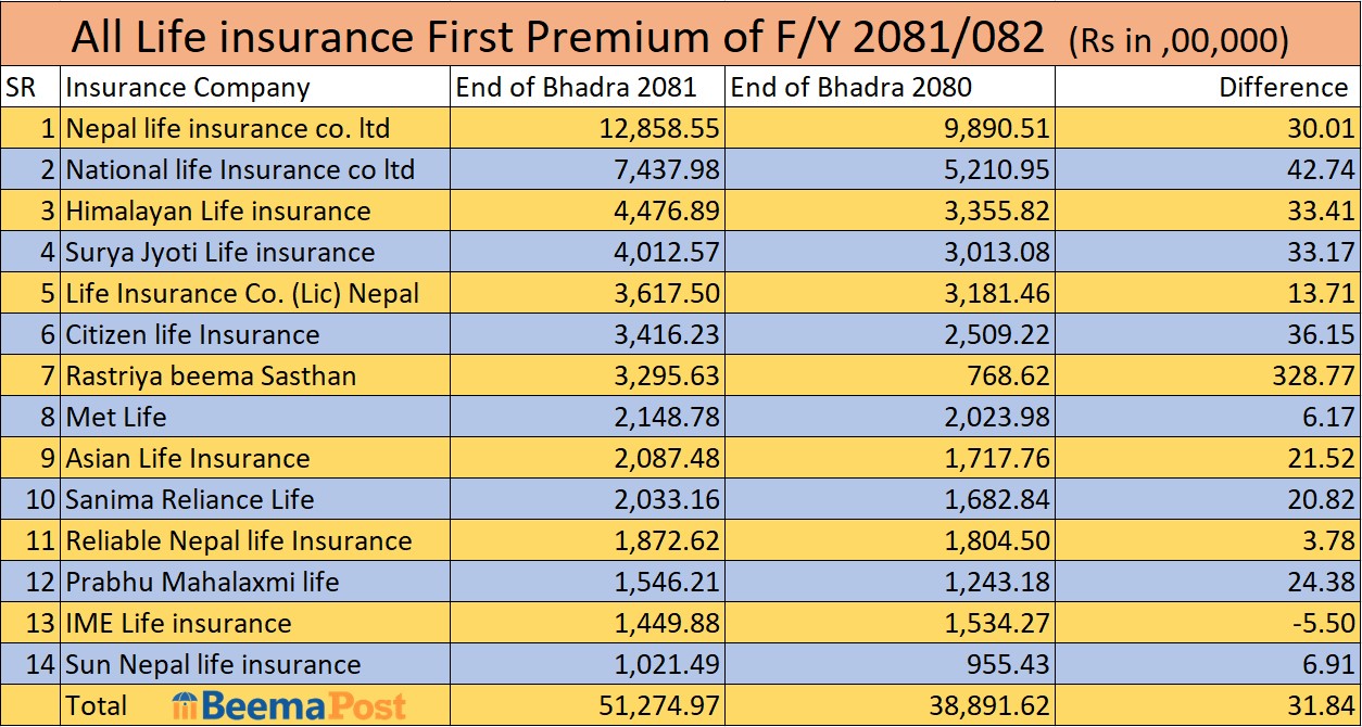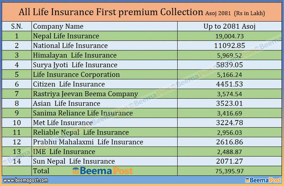 जीवन बीमा कम्पनीको प्रथम बीमाशुल्क आर्जनः नेपाल, नेशनल र हिमालयन लाइफ अग्रस्थानमा, अन्यको अवस्था कस्तो ?