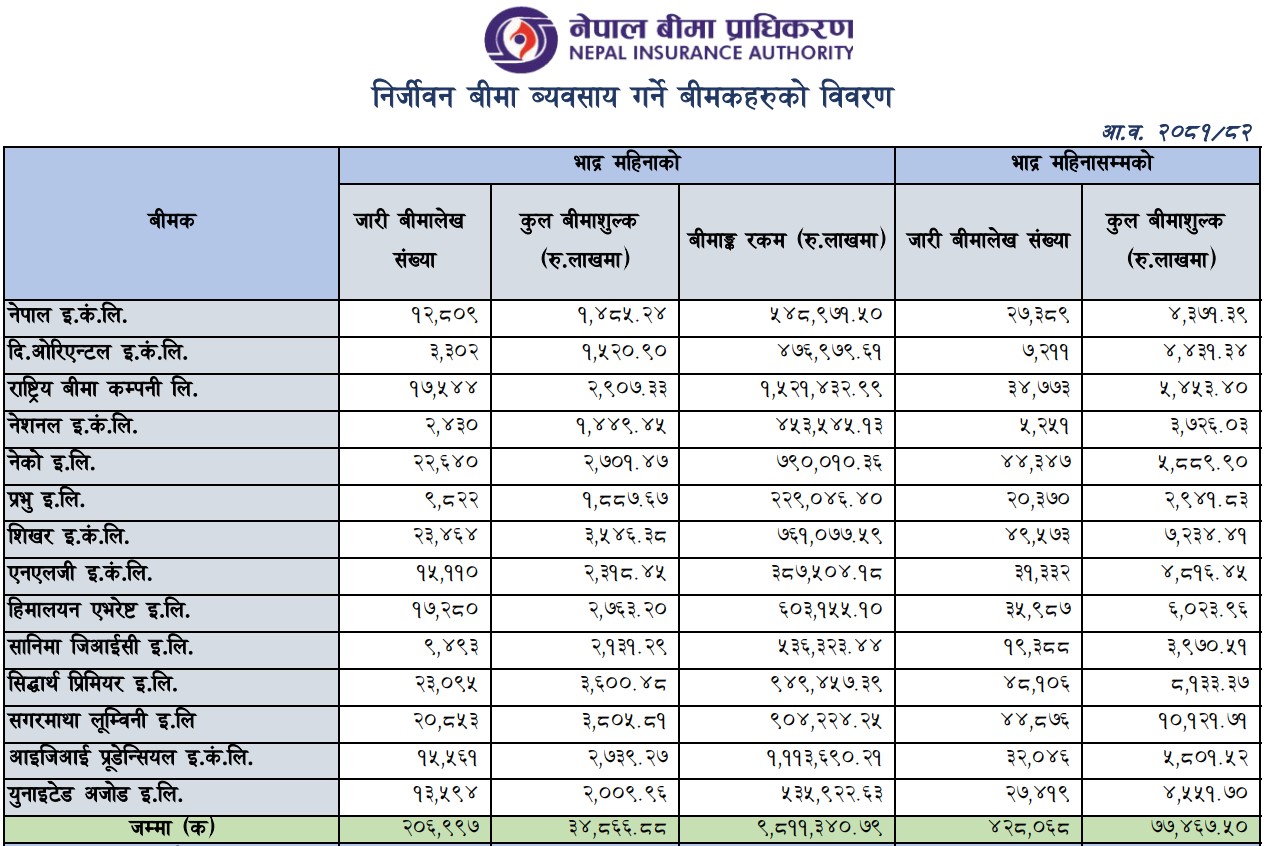 असोज महिनामा आधा जीवन बीमा कम्पनीको ब्यवसाय घट्यो, कस्को अवस्था कस्तो ?