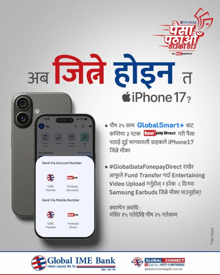 ग्लोबल आइएमईको मोबाइल बैंकिङ प्रयोगकर्ताका लागि उपहार वर्षा: आइफोन १७ जित्ने मौका