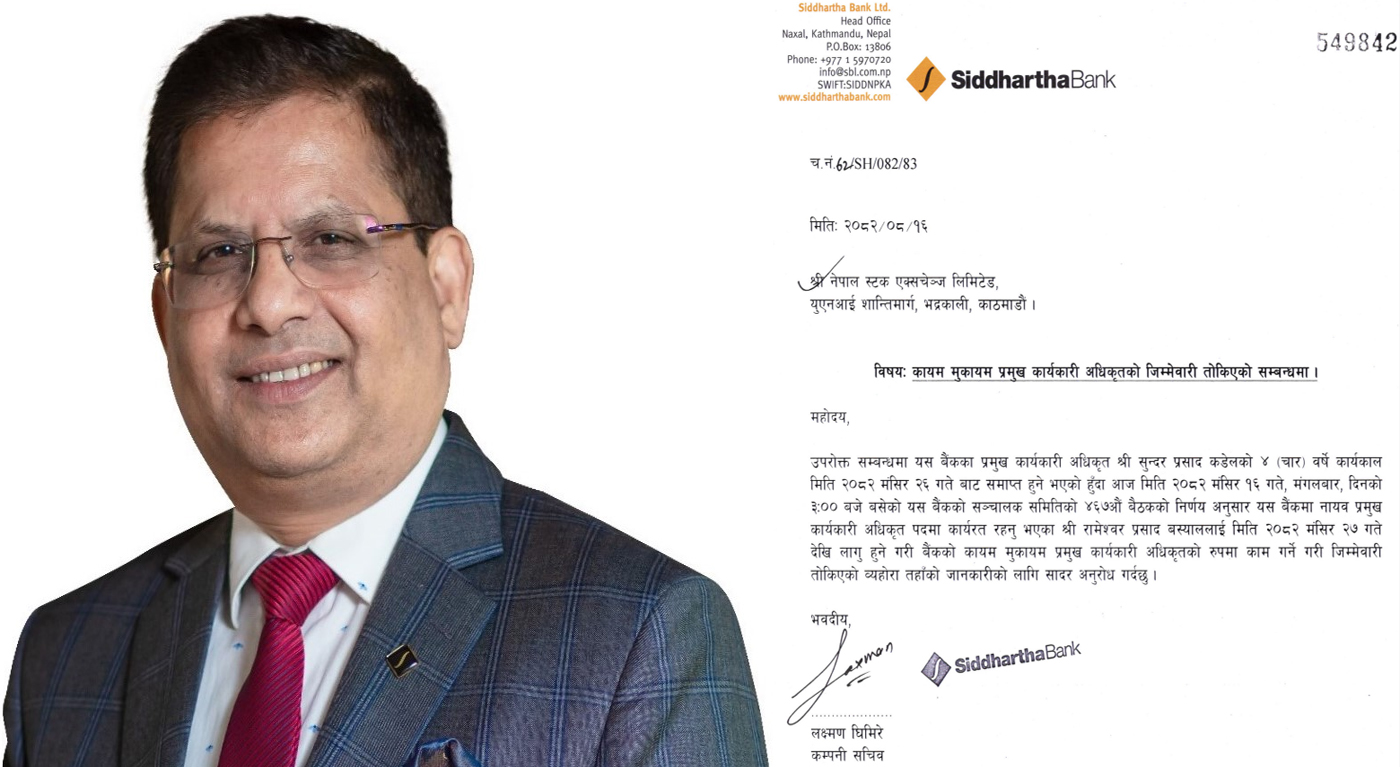 काठमाडौं । सिद्धार्थ बैंक लिमिटेडको कायम मुकायम (कामु) प्रमुख कार्यकारी अधिकृत (सीईओ) मा रामेश्वर प्रसाद बस्याल नियुक्त भएका छन्। बैंकका सीईओ रहेका सुन्दर प्रसाद कँडेलको ४ वर्षे कार्यकाल मंसिर २६ गतेबाट समाप्त हुँदैछ। सीईओको पदावधि सकिन लागेकाले बैंकको मंसिर...