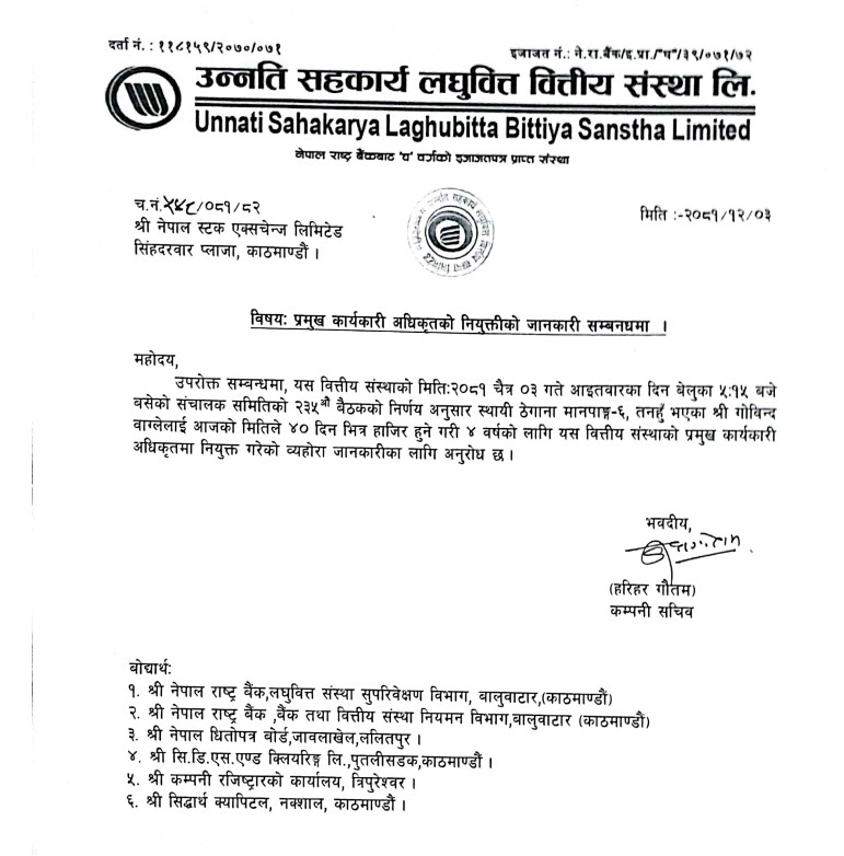 काठमाडौं । उन्नती सहकार्य लघुवित्त कम्पनीको सिईओमा गोविन्द वाग्ले नियुक्त भएका छन् । कम्पनीको सञ्चालक समितिको हिजो आइतबार बेलुका बसेको २३५ औं बैठकले वाग्लेलाई सिईओमा नियुक्त गर्ने निर्णय गरेको हो । मानपाङ ६ तनहुँ घर भएका वाग्लेलाई आगामी चार...