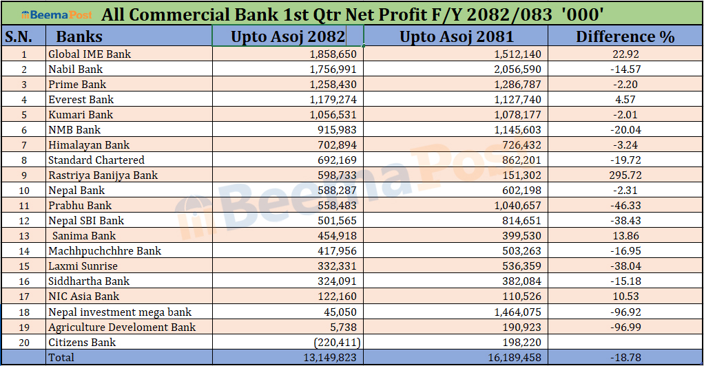 पहिलो त्रैमाससम्ममा वाणिज्य बैंकको नाफा १३ अर्ब १४ करोड, ५ बैंक अर्ब क्लबमा, कुनको अवस्था कस्तो ?