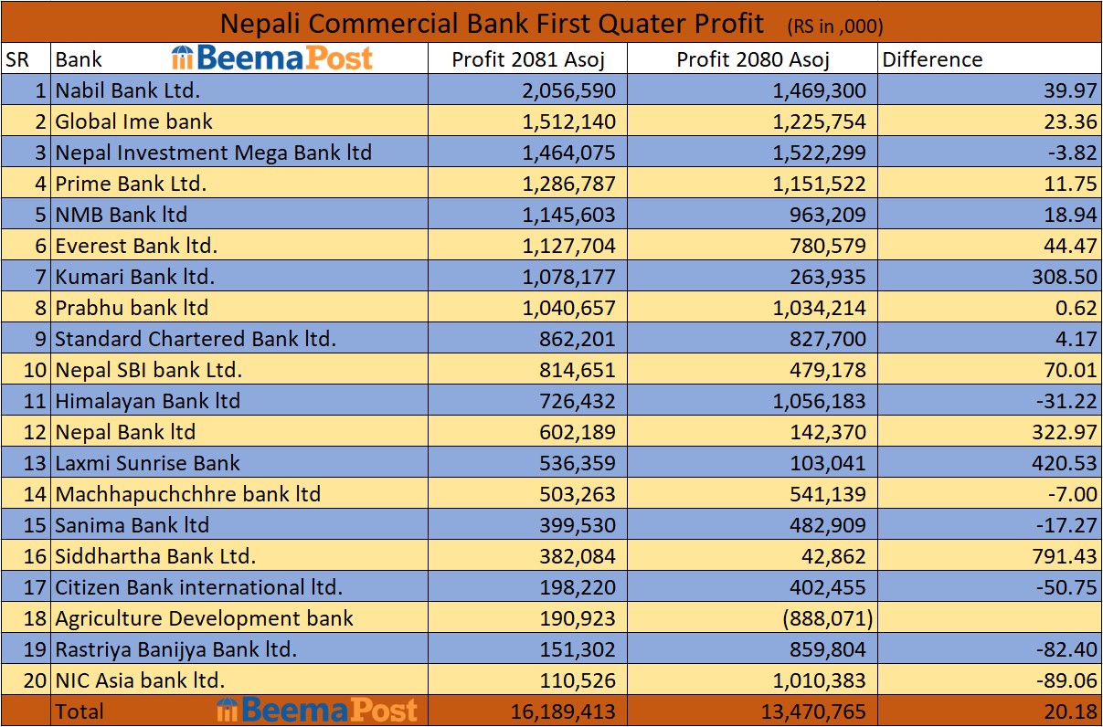 २० बैंकले तीन महिनामा कमाए १६ अर्ब, नबिल र ग्लोबल आईएमई सबैभन्दा अगाडि, अन्यको अवस्था कस्तो ?