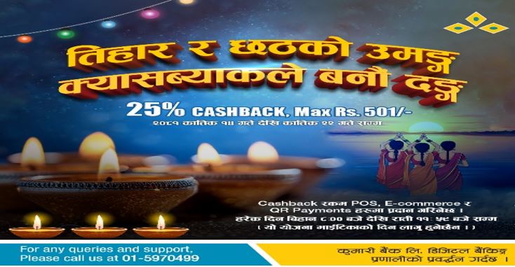 कुमारी बैंकद्वारा तिहार र छठ पर्वमा क्यासब्याक अफर, डिजिटल भुक्तानीमा प्रोत्साहन