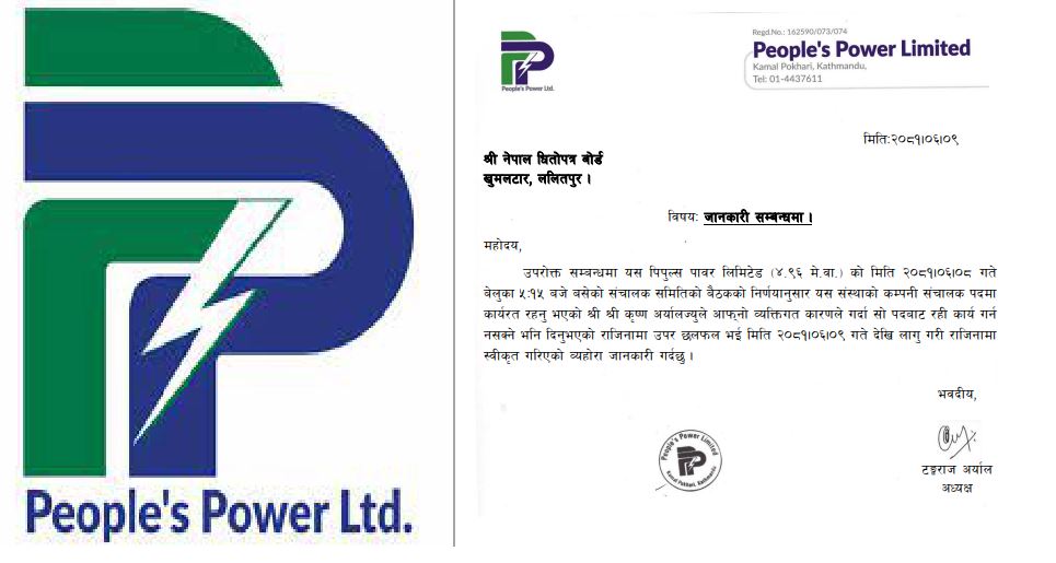 काठमाडौं। पिपुल्स पावर लिमिटेड (४.९६ मेगावाट) का सञ्चालक कृष्ण अर्यालले व्यक्तिगत कारण देखाउँदै आफ्नो पदबाट राजीनामा दिएका छन्। कम्पनीको असोज ८ गते बसेको सञ्चालक समितिको बैठकले उक्त राजीनामा स्वीकृत गरेको हो। बैठकले असोज ९ गतेदेखि लागू हुने गरी अर्यालको...