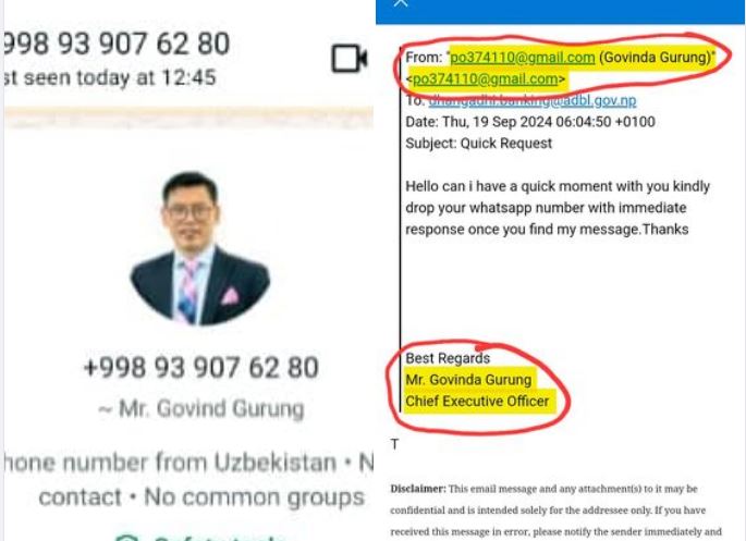 काठमाडौँ । कृषि विकास बैंकका प्रमुख कार्यकारी अधिकृत (सीईओ) गोविन्द गुरुङको नाम, फोटो र पदको अनधिकृत प्रयोग गर्दै एक अपरिचित ब्यक्तिले ठगी गर्ने प्रयास गरेको खुलासा भएको छ । उज्वेकिस्तानको फो नम्बर र नक्कली इमेलमार्फत गुरुङको नामबाट विभिन्न व्यक्तिहरुलाई...