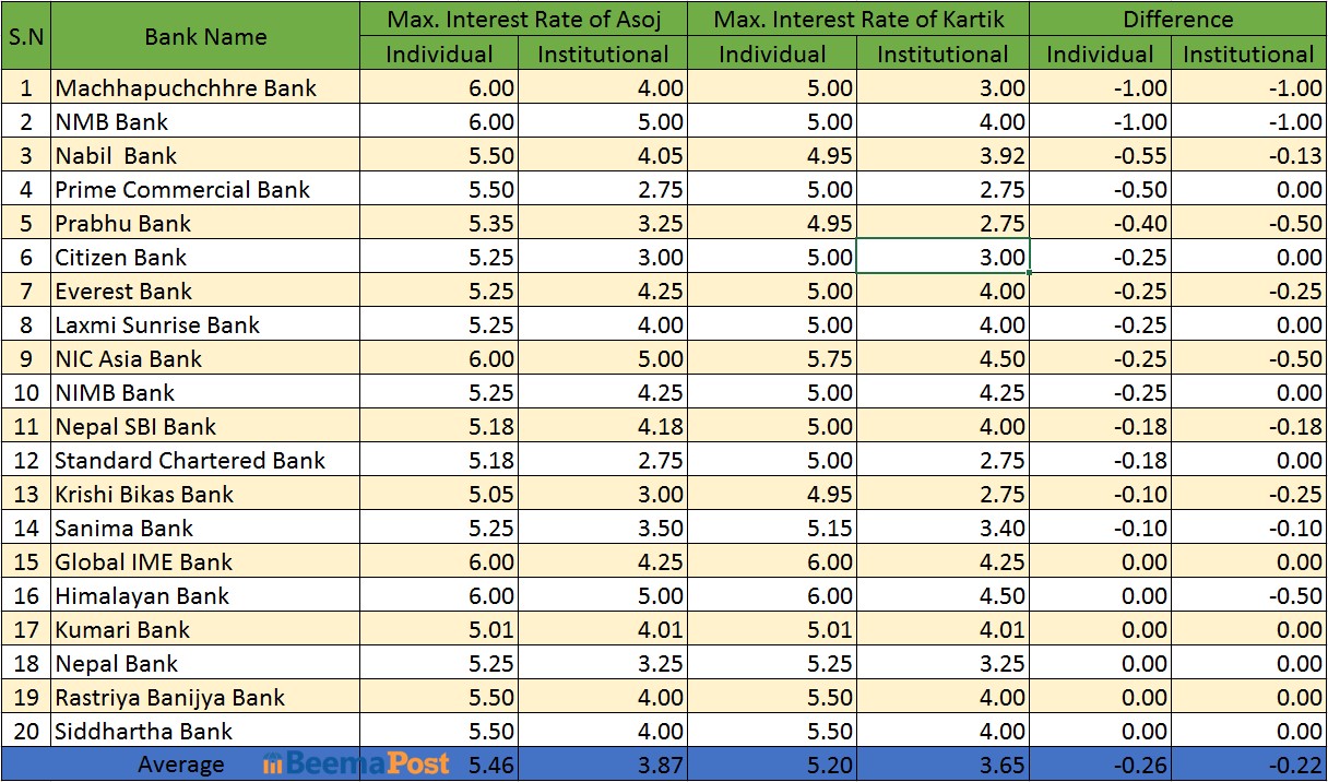 कात्तिक महीनामा वाणिज्य बैंकहरूको ब्याजदर घट्यो, कुनले कति दिन्छन्?