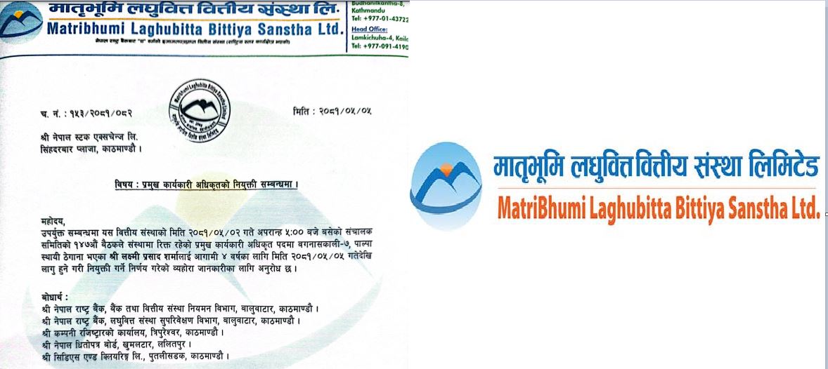 काठमाडौँ । मातृभूमि लघुवित्त वित्तीय संस्था लिमिटेडले प्रमुख कार्यकारी अधिकृत (सीइओ) मा लक्ष्मी प्रसाद शर्मालाई नियुक्त गरेको छ । कम्पनीको भदौ २ गते बसेको संचालक समितिको बैठकले शर्मालाई सीइओको जिम्मेवारी दिएको हो । पाल्पा घर भएका शर्मालाई भदौ ५...
