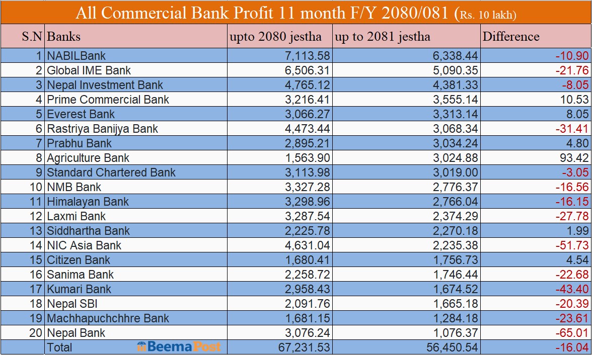 चालु आवको ११ महिनामा वाणिज्य बैंकको मुनाफा उच्च गिरावट, नेपाल बैंकको ६५ प्रतिशतले घट्दा, अन्यको कति ? (सूची सहित)