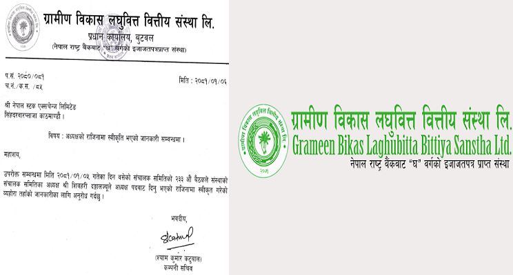 काठमाडौँ । ग्रामिण विकास लघुवित्त वित्तीय संस्थाका अध्यक्ष शिवहरी दङ्गालको राजीनामा स्वीकृत भएको छ । कम्पनीको बैशाख ५ गते बसेको संचालक समितिको बैठकले उनको राजीनामा स्वीकृत समेत गरेको छ । दंगाल २०७८ भदौ ५ गतेदेखि कम्पनीको संस्थापक शेयरधनीको तर्फबाट...
