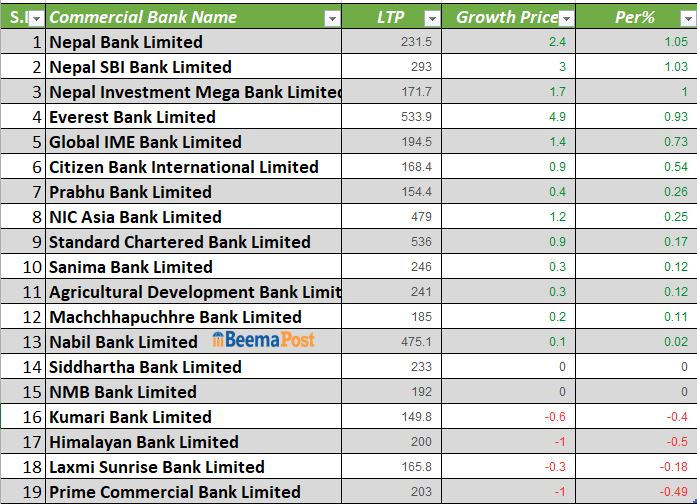 १३ वाणिज्य बैंकको सेयर मूल्य बढ्यो, कुनको कति ?