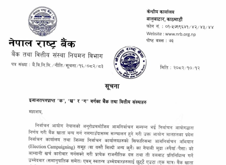 काठमाडौं । प्रतिनिधिसभा निर्वाचनका लागि चन्दा सहयोग गर्न भन्दै जथाभावी खाताको क्युआर कोड पठाउन नपाइने भएको छ । निर्वाचन आयोगको आग्रहमा नेपाल राष्ट्र बैंकले आमनिर्वाचनको क्रममा हुने आर्थिक कारोबारलाई पारदर्शी बनाउन राजनीतिक दल तथा उम्मेदवारहरूका लागि छुट्टै बैंक खाता...