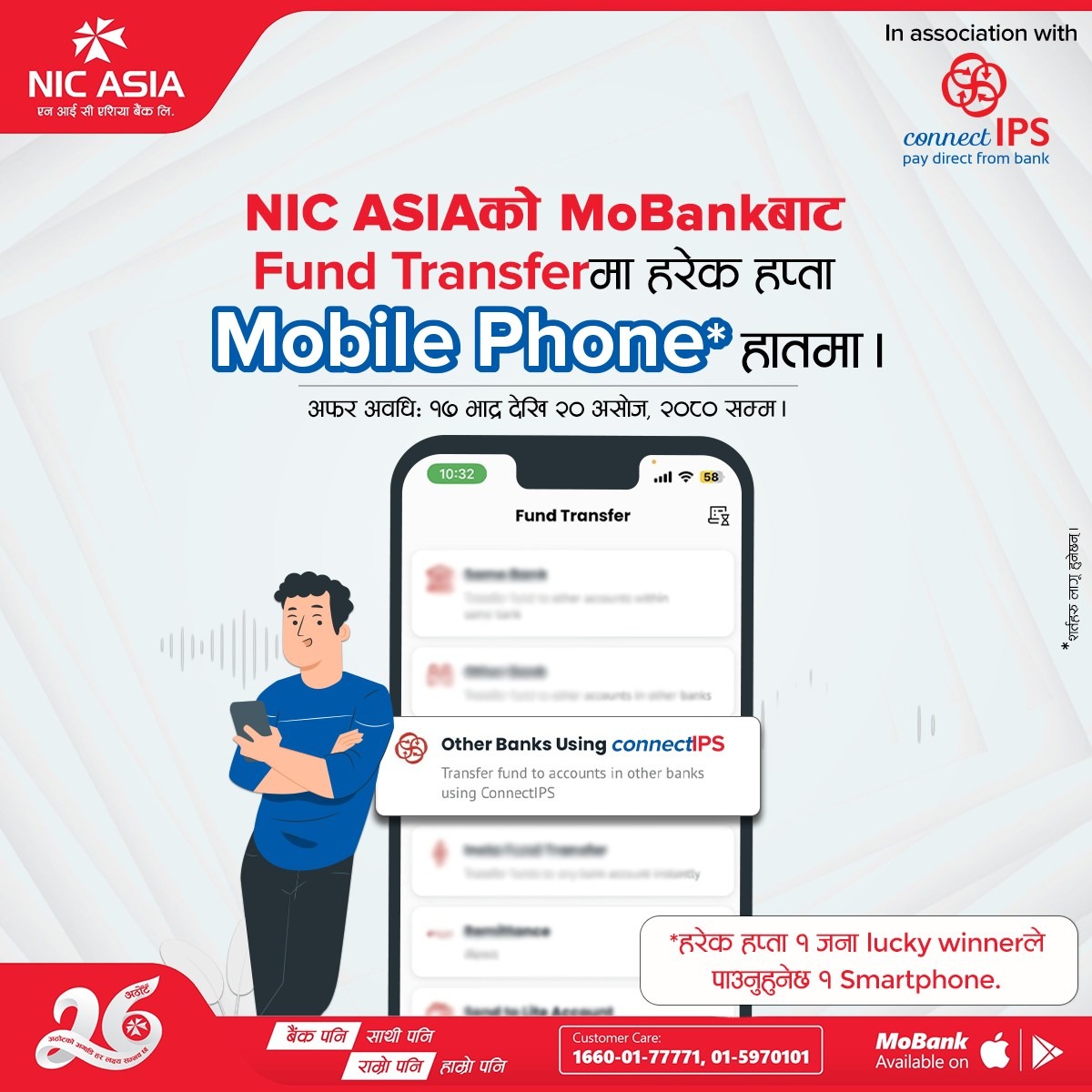 काठमाडौं । डिजिटल बैंकिङ्गमा मुलुकको अग्रणी स्थानमा रही सहज बैंकिङ्ग सेवा तथा सुविधा प्रदान गर्दै आइरहेको एनआईसी एशिया बैंकले कनेक्ट आईपीएससँँगको सहकार्यमा आफ्ना मोवाइल बैंकिङ्ग ग्राहकका लागि ‘फण्ड ट्रान्सफरमा हरेक हप्ता मोबाईल फोन हातमा’ अफर सार्वजनिक गरेको छ ।...