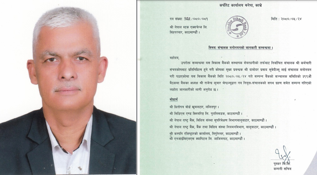 काठमाडौं । सिन्धु विकास बैंकले नयाँ सञ्चालक चयन गरेको छ । बैंकले कर्मचारी संचयकोषबाट प्रतिनिधित्व हुने गरी कोेषका मुख्य प्रबन्धक दामोदर प्रसाद सुवेदीलाई सञ्चालक मनोनयन गरेको हो । बैंकको भदौ २४ गते (आईतबार) बसेको सञ्चालक समितिको बैंठकको निर्णयले सुवेदीलाई...