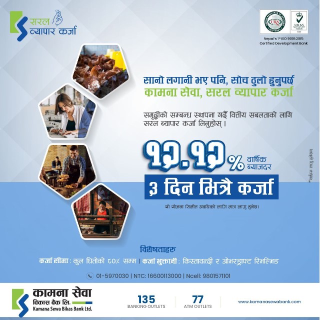 कामना सेवा विकास बैंकको कर्जाका लागि नयाँ ब्याजदर ‘१२.१२’ सार्वजनिक
