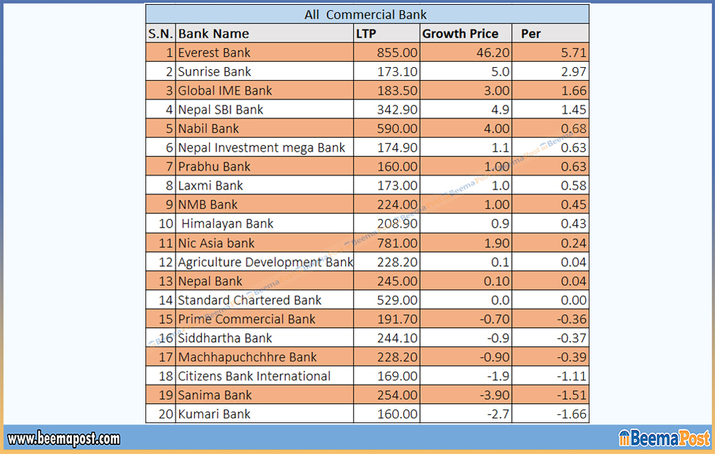 साताको अन्तिम दिन शेयर बजार घटेपनि बैंकिङ्ग क्षेत्रमा उत्साहप्रद मूल्य बृद्धि, एभरेष्ट, एनआईसी एशिया र नबिलको शेयरमूल्य सबैभन्दा उच्च