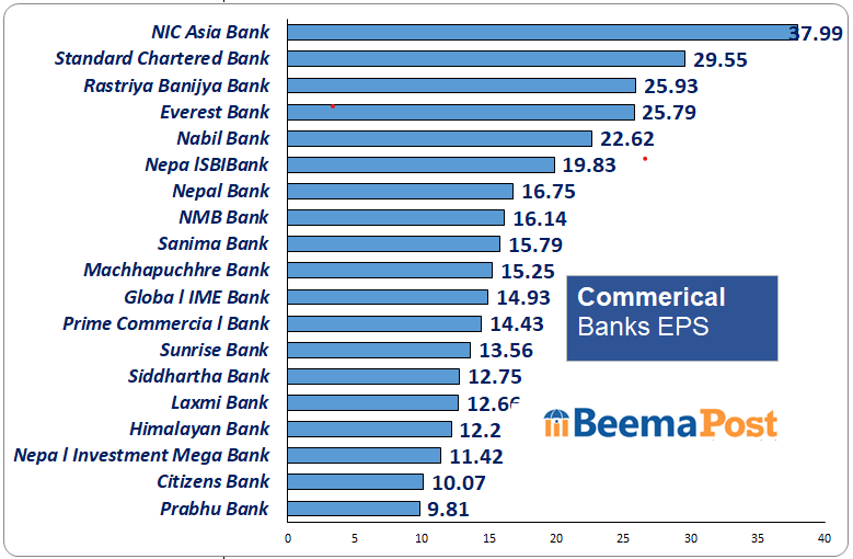 वाणिज्य बैंकहरुको प्रतिशेयर आम्दानी ३० रुपैयाँ मुनि, सबैभन्दा धेरै एनआईसी एशिया बैंकको, अन्यको कति ? (इन्फोग्राफ सहित)