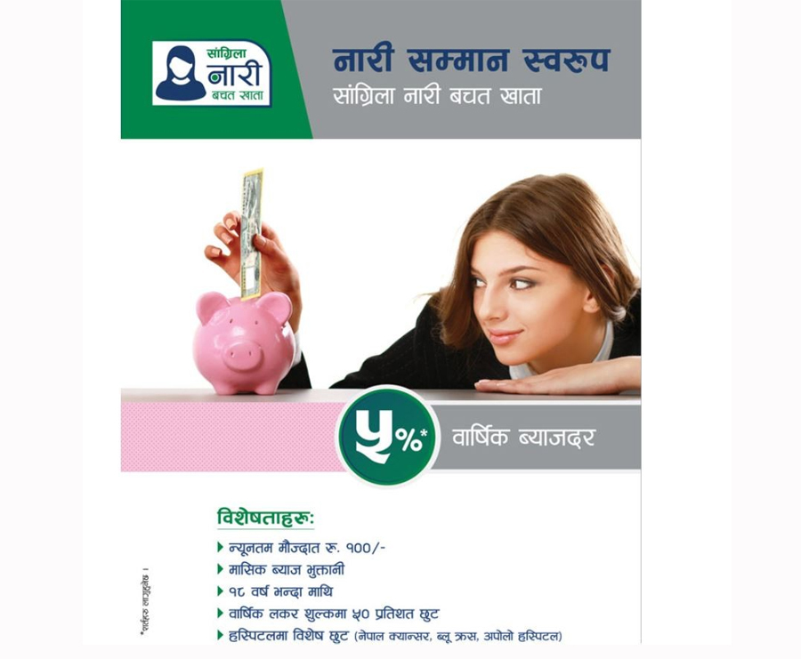 सांग्रिला डेभलपमेन्ट बैंकको नारी बचत खाता खोल्दा लकर शुल्कमा ५०% छुट