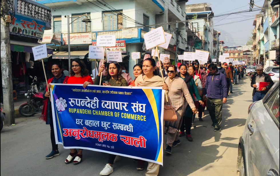 घर बहाल र बैंकको ब्याजदर घटाउन माग गर्दै बुटवलका व्यवसायी आन्दोलित