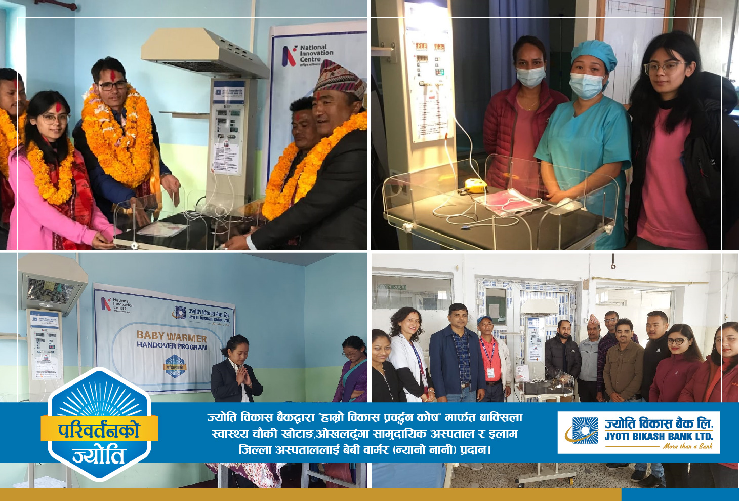 काठमाडौं । ज्योति विकास बैंकले संस्थागत सामाजिक उत्तरदायित्व प्रयोजनार्थ स्थापना गरेको ‘हाम्रो विकास प्रवर्द्धन कोष मार्फत बाक्सिला स्वास्थ्य चौकी (खोटाङ, ओखलढुंगा सामुदायिक अस्पताल र जिल्ला अस्पताल ( इलामलाई राष्ट्रिय आविष्कार केन्द्रद्वारा स्वदेशमै निर्मित बेबी वार्मर प्रदान गरेको छ। बैंकले...
