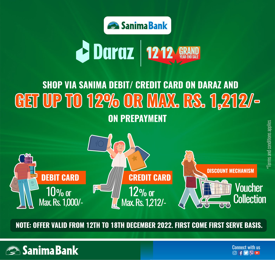 काठमाडौं । सानिमा बैंकले आफ्ना ग्राहकहरुका लागि दराजसंग “Daraz 12.12” योजनामा विशेष छुट दिने सहकार्य गरेको छ । योजना अवधिभर ग्राहकहरुले दराजबाट सामान खरिद गर्दा सानिमा बैंकको डेबिट वा क्रेडिट कार्डबाट भुक्तानी गर्दा विशेष छुट प्राप्त गर्न सक्नेछन् ।...