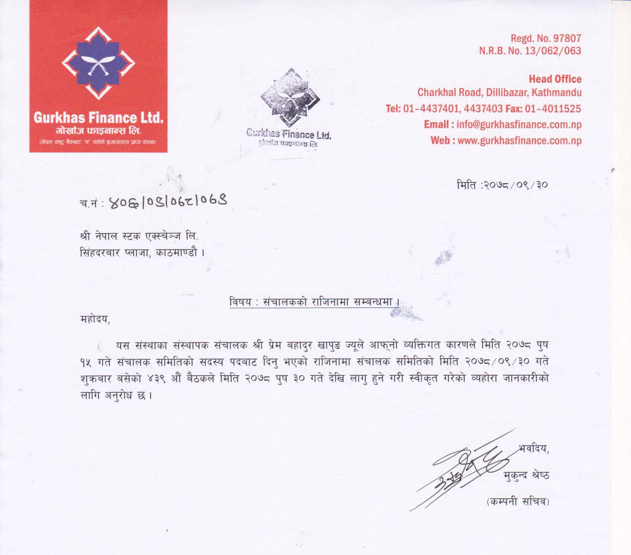 गोर्खाज फाइनान्सका संचालक खापुङद्धारा राजिनामा