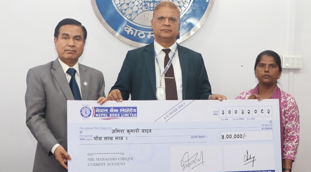 काठमाडौँ । नेपाल बैंक लिमिटेडले सडक दुर्घटनामा परी ज्यान गुमाएका मकवानपुर जिल्लाका एक शिक्षकको परिवारलाई बीमा दाबी रकम स्वरूप पाँच लाख रुपैयाँ भुक्तानी गरेको छ। बैंकको पालुङ शाखाका कर्मचारी तलब खाता ग्राहकसमेत रहेका रघुनन्दन यादवको निधनपछि बैंकले उक्त बीमा...