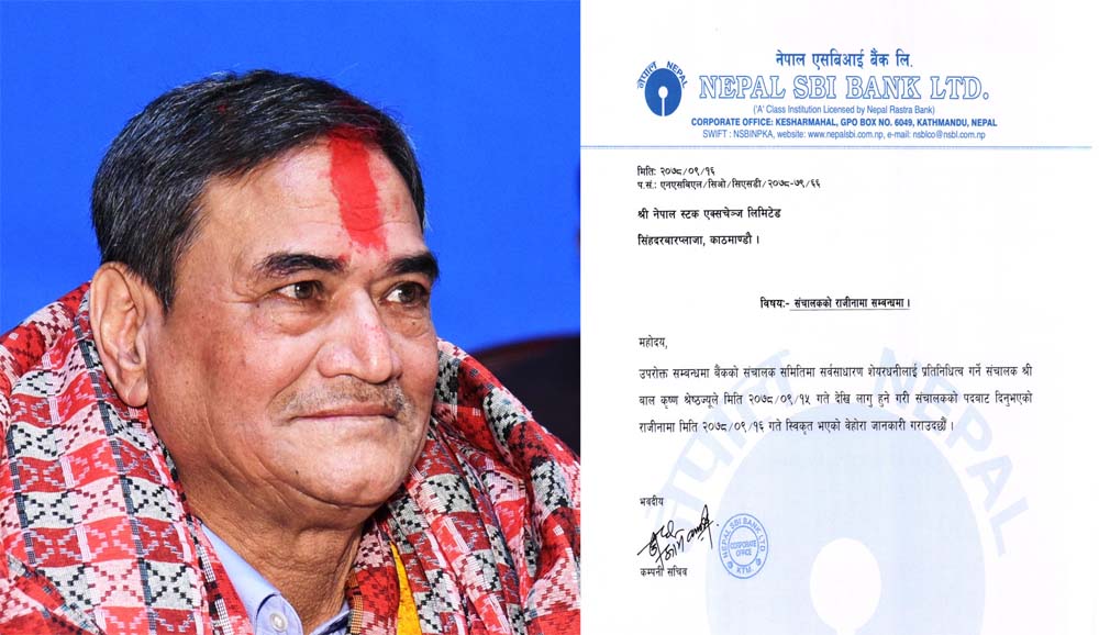काठमाडौं । नेपाल एसबिआई बैंक लिमिटेडका संचालक बालकृष्ण श्रेष्ठले राजिनामा दिएका छन् । कम्पनीको संचालक समितिमा सर्वसाधारण शेयरधनीको तर्फबाट प्रतिनिधित्व गर्ने संचालक श्रेष्ठले सो पदबाट पुष १५ गतेबाट लागूहुनेगरी दिएको राजिनामा पुष १६ गते स्वीकृत भएको हो ।
