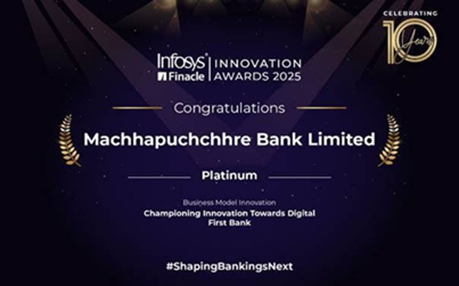 डिजिटल नवप्रवर्तनमा माछापुच्छ्रे बैंकलाई अन्तर्राष्ट्रिय प्लाटिनम अवार्ड