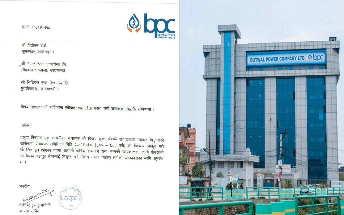 काठमाडौँ । बुटवल पावर कम्पनी लिमिटेडको सञ्चालकमा शेयरधनी बिजय बहादुर श्रेष्ठलाई नियुक्त गरेको छ । कम्पनीको सञ्चालक समितिको माघ १६ गते बसेको बैठकको निर्णयले कम्पनीका सञ्चालक विजय श्रेष्ठले दिएको राजिनामा स्वीकृत गर्नुका साथै नयाँ सञ्चालकमा बिजय बहादुर श्रेष्ठलाई नियुक्त...