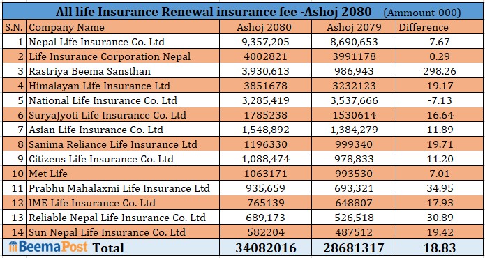 पहिलो त्रैमासमा जीवन बीमा कम्पनीहरुको नविकरण बीमा शुल्क आर्जन झण्डै ३५ अर्ब, कुन कम्पनीले कति भित्र्याए ? (तथ्याङ्कसहित)
