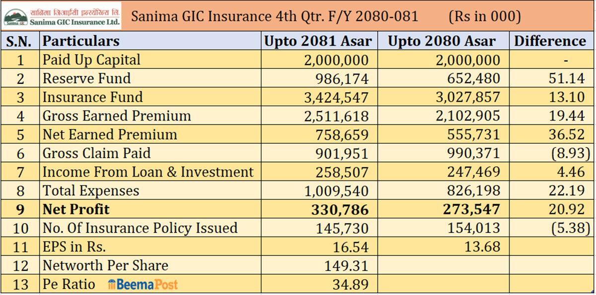 २० प्रतिशतले बढ्यो सानिमा जिआईसी इन्स्योरेन्सको मुनाफा, इपिएससहित अधिकांश सूचक उकालो यात्रामा