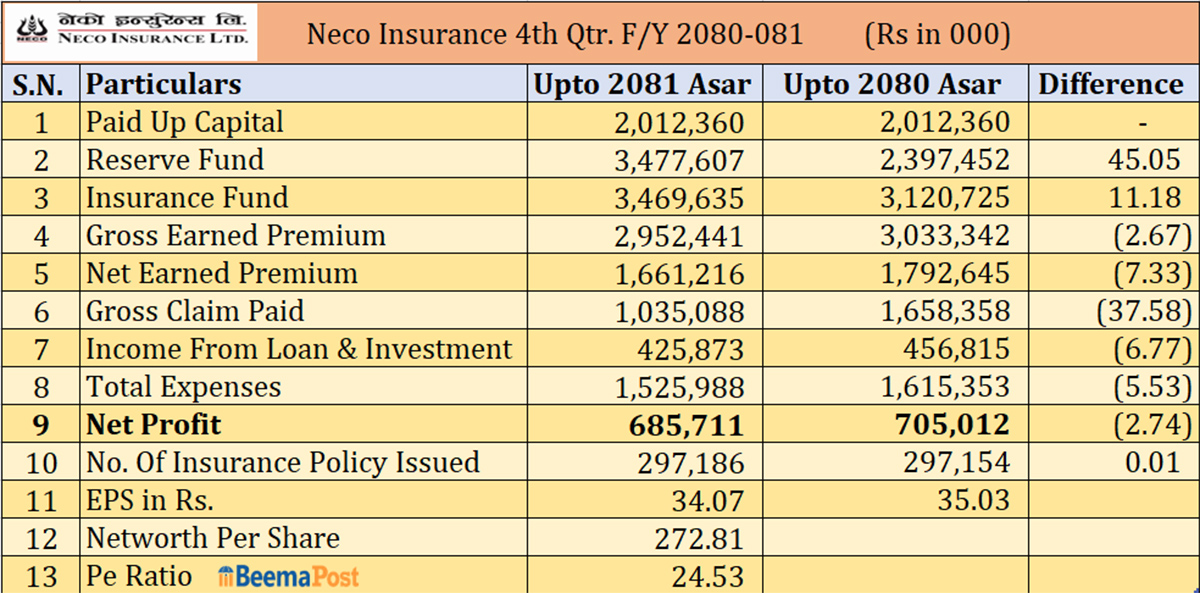 ब्यवसाय घट्दा समेत नेको इन्स्योरेन्सको मुनाफा साढे ६८ करोड, कस्ता छन् अन्य सूचक ?