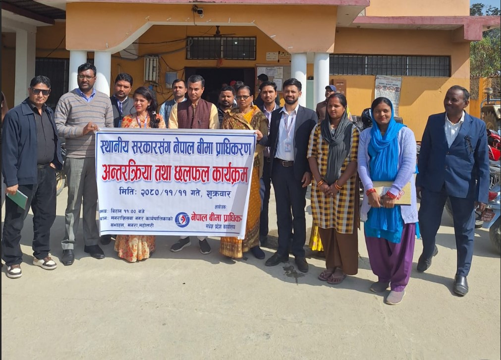 काठमाडौं । नेपाल बीमा प्राधिकरण मधेश प्रदेशले महोत्तरी जिल्लाको मनरासिस्वा नगरपालिकासँग फागुन ११ गते पालिकाको सभाहलमा बीमा अन्तरक्रिया कार्यक्रम सम्पन्न गरेको छ । कार्यक्रममा नेपाल बीमा प्राधिकरण मधेश प्रदेश कार्यालय प्रमुख कुशुम शर्मा, नगर प्रमुख मोहन पाण्डेय, नगर उपप्रमुख...