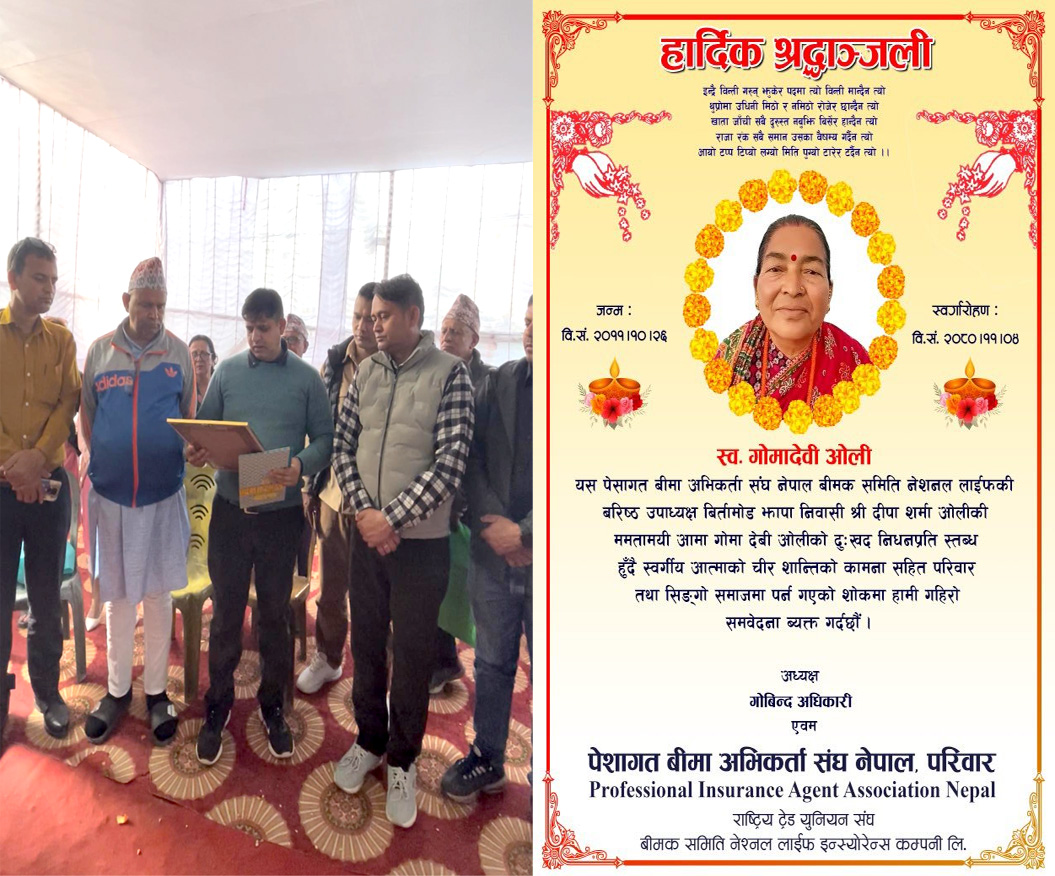 काठमाडौं । पेशागत बीमा अभिकर्ता संघले झापाकी गोमादेवी ओलीको निधनमा शोक तथा श्रद्धाञ्जली सभा आयोजना गरेको छ । पेशागत बीमा अभिकर्ता संघ, बीमक समिति नेशनल लाइफ इन्स्योरेन्सकी वरिष्ठ उपाध्यक्ष दीपा शर्मा ओलीकी माता गोमादेवी ओलीको निधनमा संघका पदाधिकारीहरु झापा...