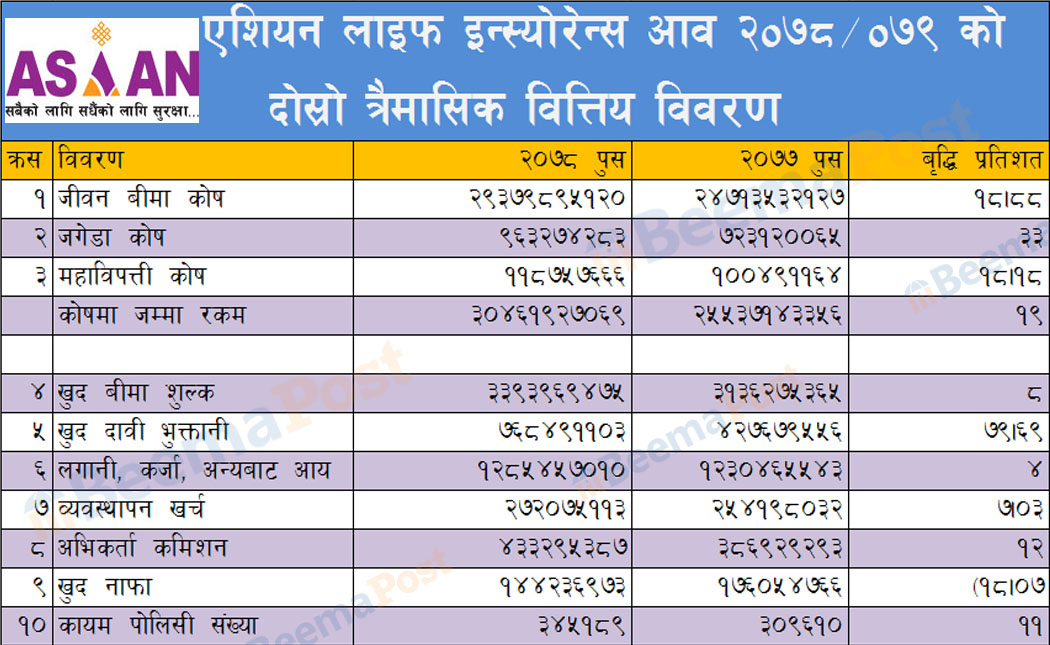 एशियन लाइफले खडा गर्यो २९ अर्बको जीवन बीमा कोष, बीमा शुल्क आम्दानी ८%ले बढ्यो