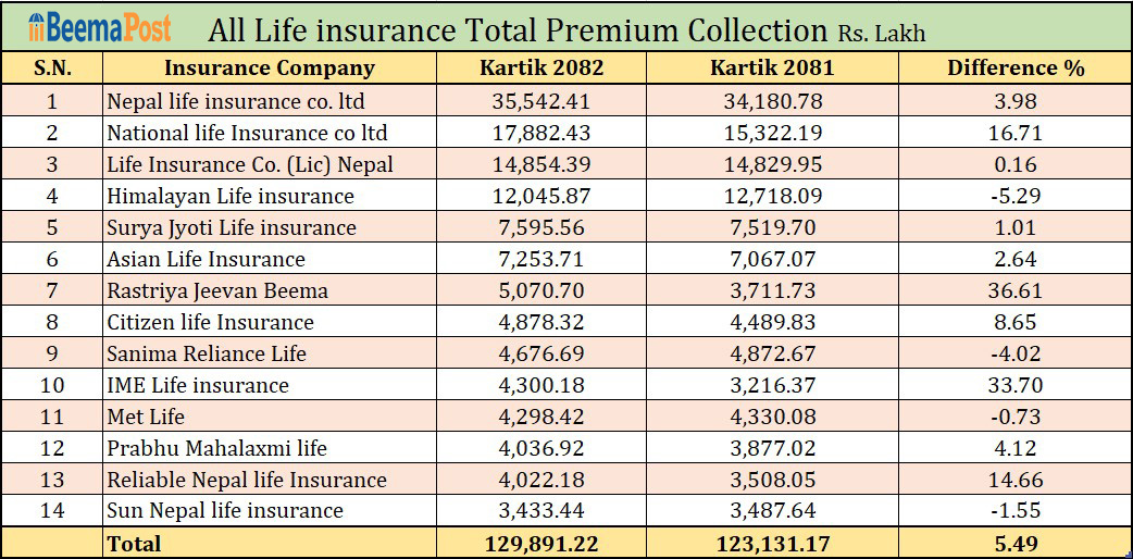 जीवन बीमा कम्पनीहरूको एकल बीमाशुल्क आर्जन ६२ प्रतिशत बढ्यो, कुन कम्पनीको कति?