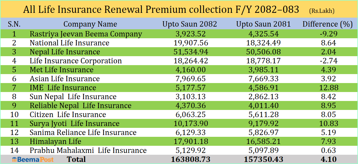 जीवन बीमा कम्पनीद्वारा साउनमा १६ अर्ब नविकरण बीमा शुल्क आर्जन, अग्रस्थानमा नेपाल र नेशनल