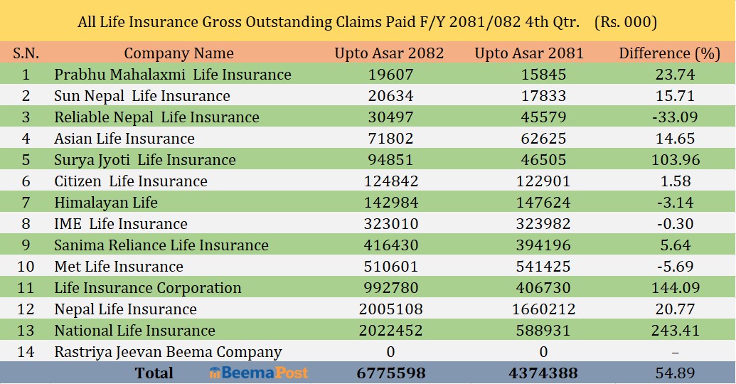 जीवन बीमा कम्पनीहरुको बीमा दावी बक्यौता ६ अर्ब ७७ करोड, प्रभु महालक्ष्मी र सन नेपालको सबैभन्दा कम