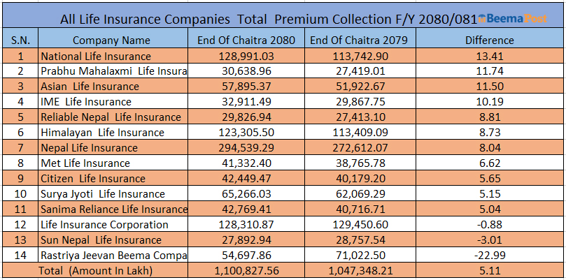 एक महिनामा जीवन बीमा कम्पनीको प्रथम बीमा शुल्क २ अर्ब ७९ करोड, कुनको कति ?
