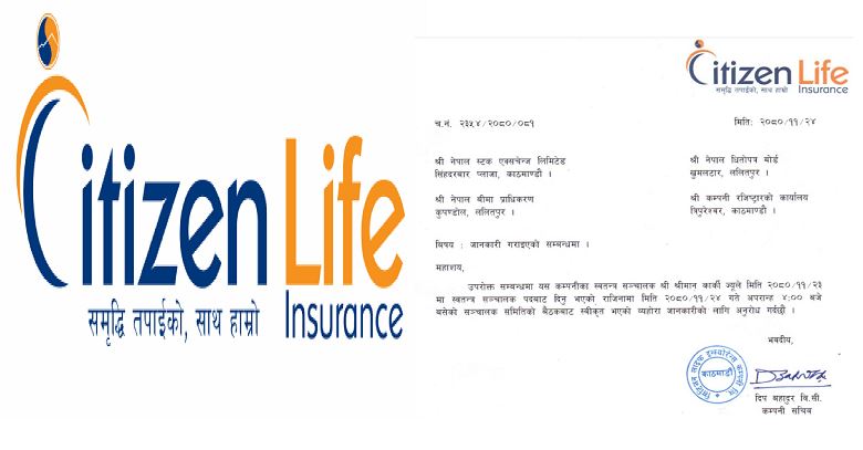 काठमाडौँ । सिटिजन लाइफ इन्स्योरेन्सका स्वतन्त्र संचालक श्रीमान कार्कीले राजीनामा दिएका छन् । कार्कीले फागुन १३ गते स्वतन्त्र संचालकबाट राजीनामा दिएका हुन् । उनको राजीनामा फागुन २४ गते बसेको संचालक समितिको बैठकले स्वीकृत गरेको हो ।