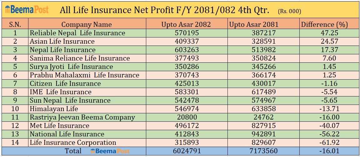 १४ जीवन बीमा कम्पनीले कमाए ६ अर्ब मुनाफा, अग्रस्थानमा नेपाल र आइएमई, रिलायबल–एशियनको उच्च ग्रोथ